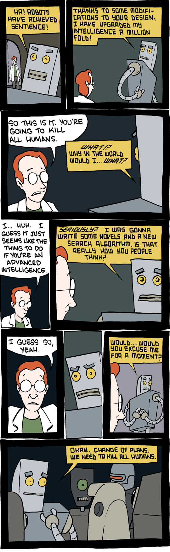 The following cartoon has been circulating for a while around the general singularity and transhumanist community, but because it is so funny, I thought I’d post it anyway. Even if you may have seen it before you may still find it funny again… I know I laugh every time I read it, and I’ve read it a dozen times by now
